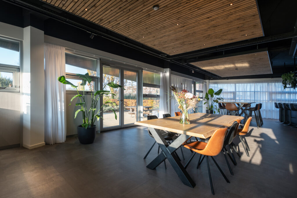 In de ruime vergaderzaal kan niet alleen Kromwijk zelf om de tafel zitten maar is er ook ruimte voor externe samenkomsten zoals voor branchevereniging ElektroNED. De ruimte is een perfecte plek om bijeenkomsten te plannen. Boven de grote vergadertafel is de ONE-AND-ONLY van Deltalight geïnstalleerd. Aangestuurd door een bewegingssensor die direct bij binnenkomst de ruimte een warme en prettige sfeer geeft.