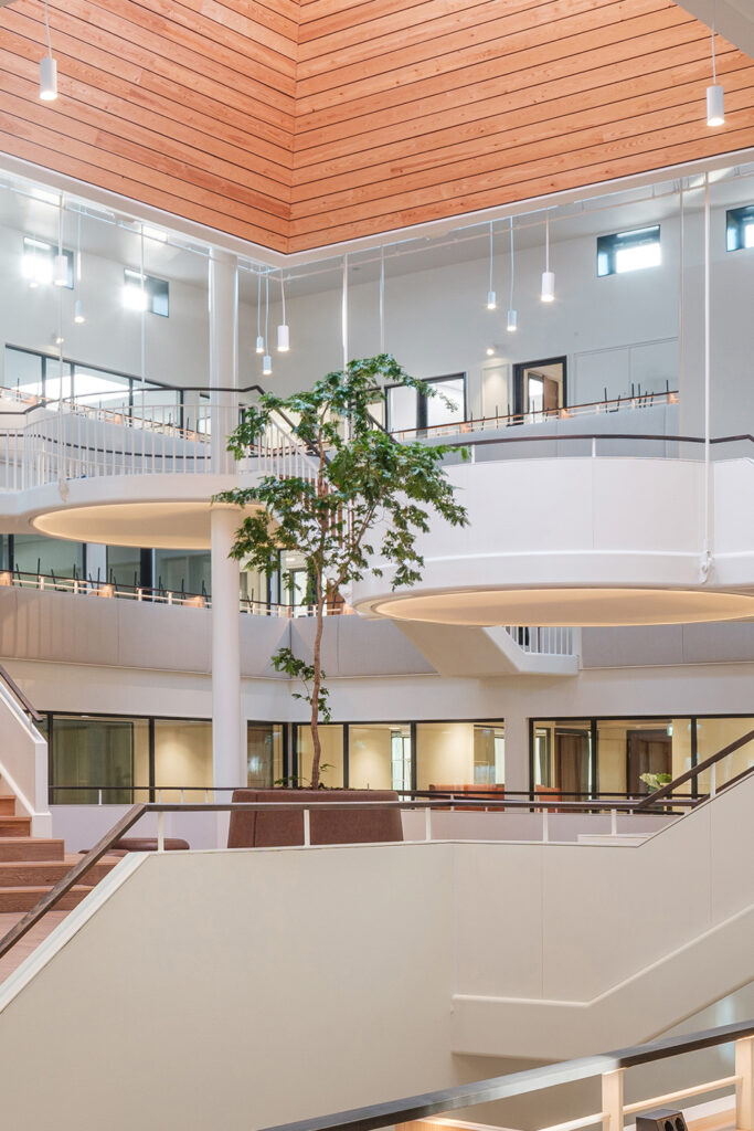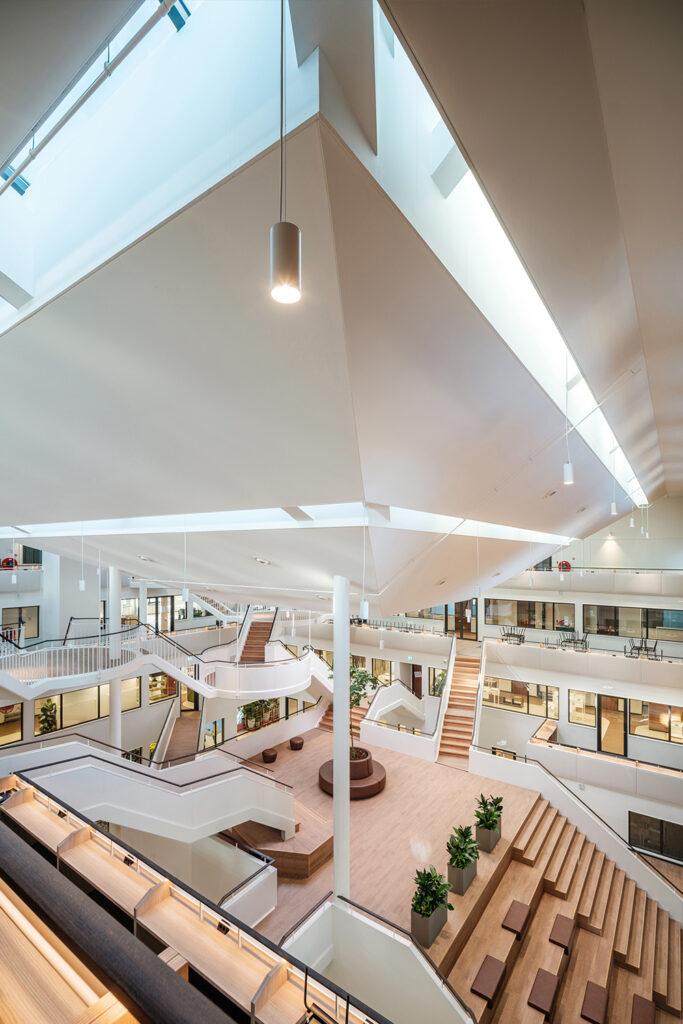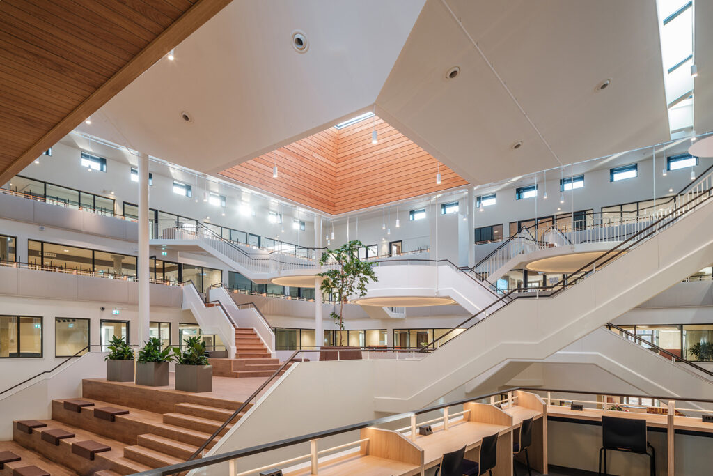 Het schoolgebouw is opgebouwd uit diverse units die in het centrale hart samenkomen in de gemeenschappelijke hal. De zichtbare ronde balkonranden rond de gemeenschappelijke hal zijn aan de onderzijde op subtiele wijze uitgelicht met LED elementen achter een diffuse afscherming.