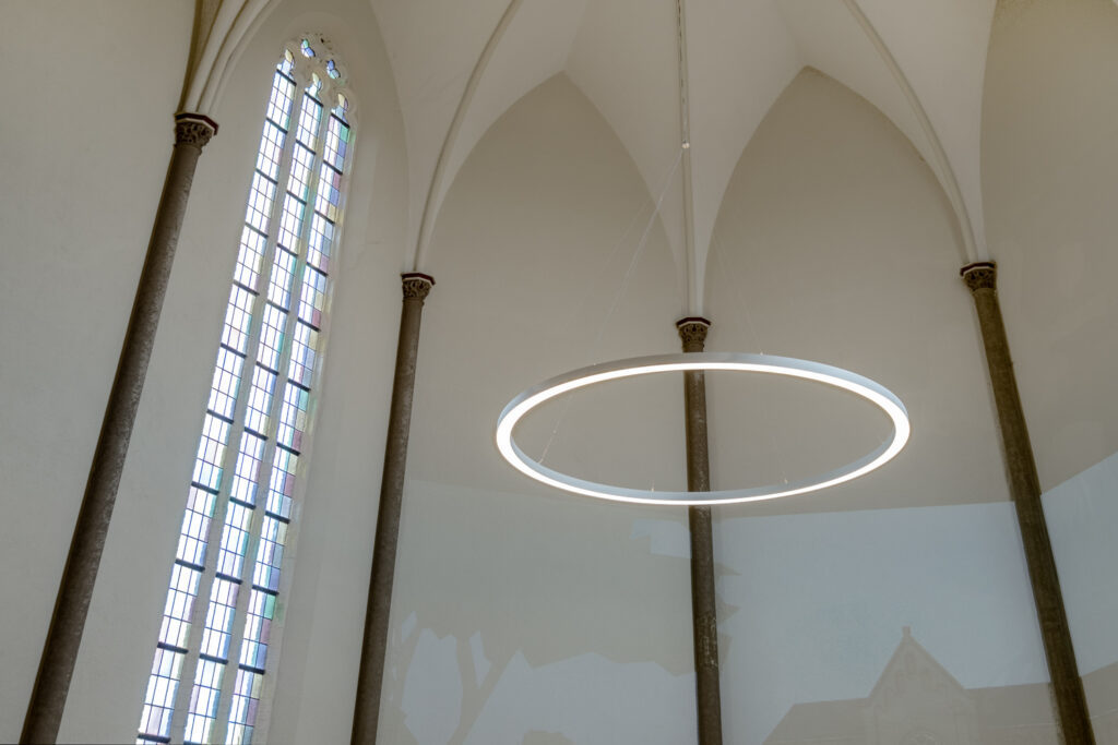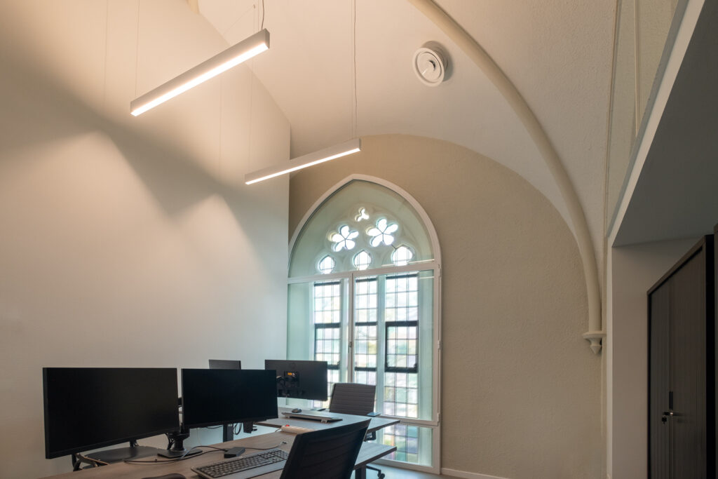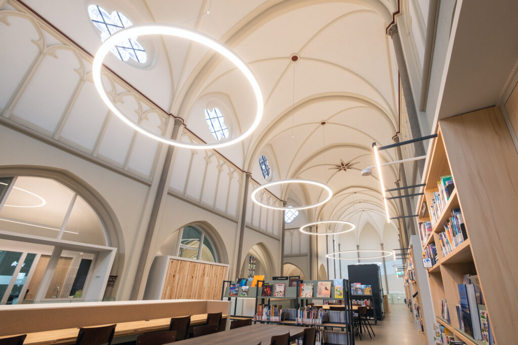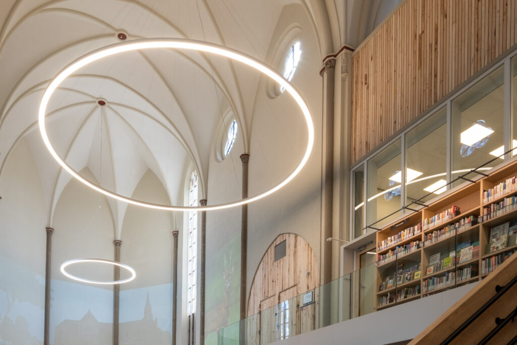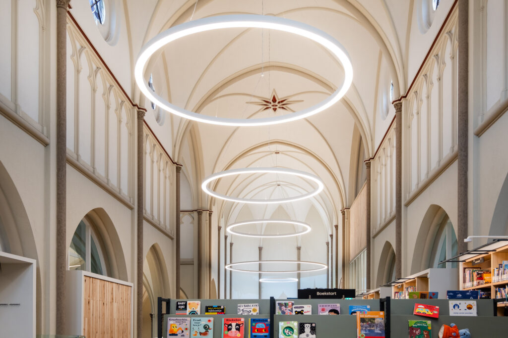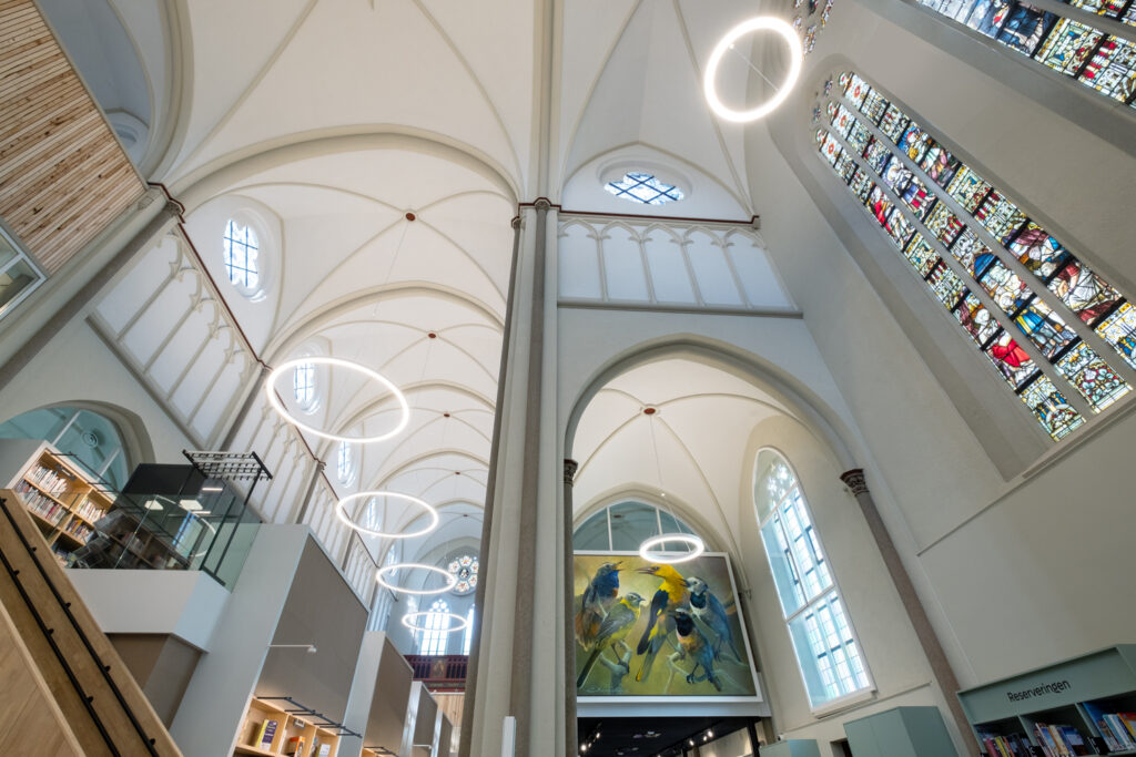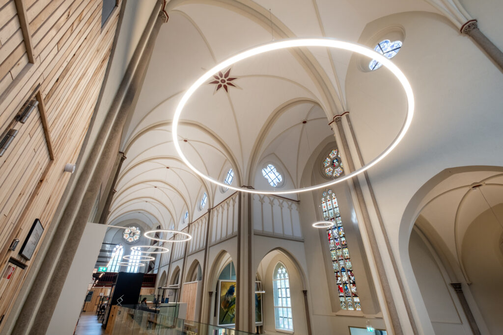 De hoge gewelven lenen zich perfect voor decoratieve ringarmaturen, die niet alleen een visuele blikvanger zijn maar ook zorgen voor een krachtige lichtopbrengst.