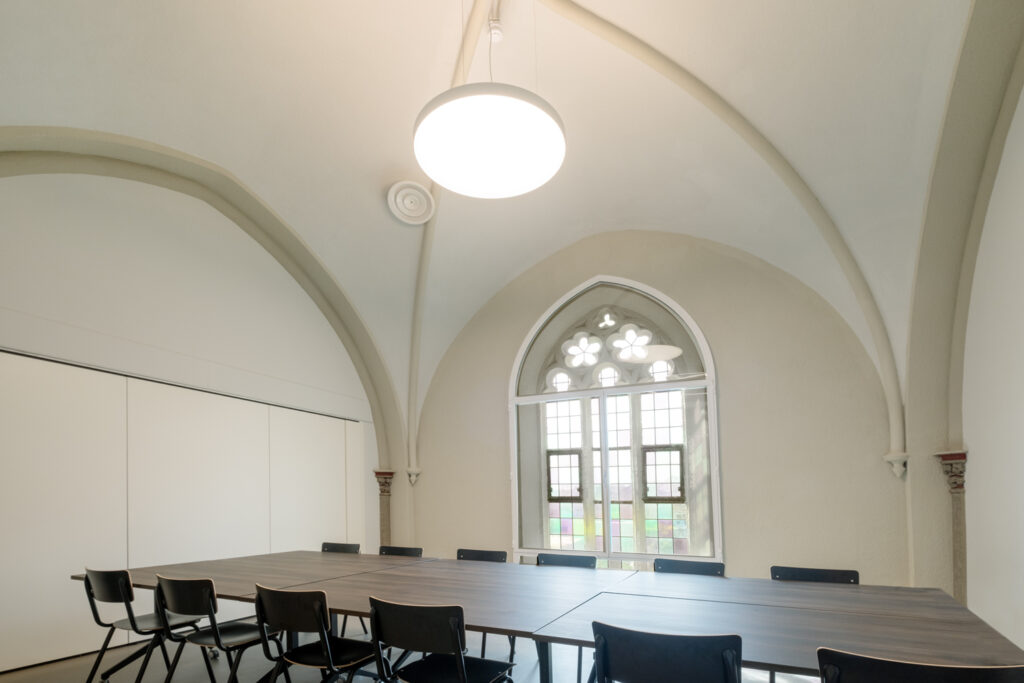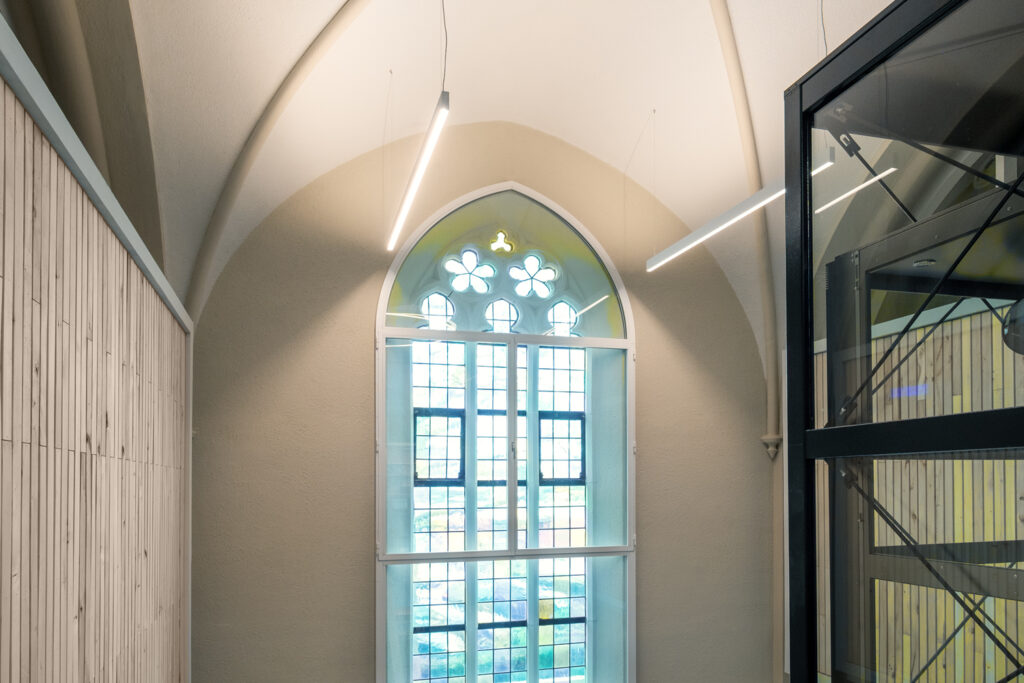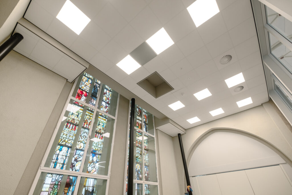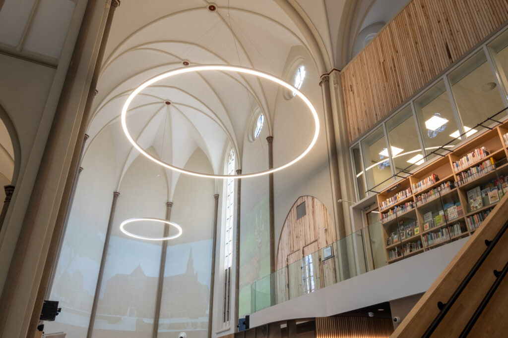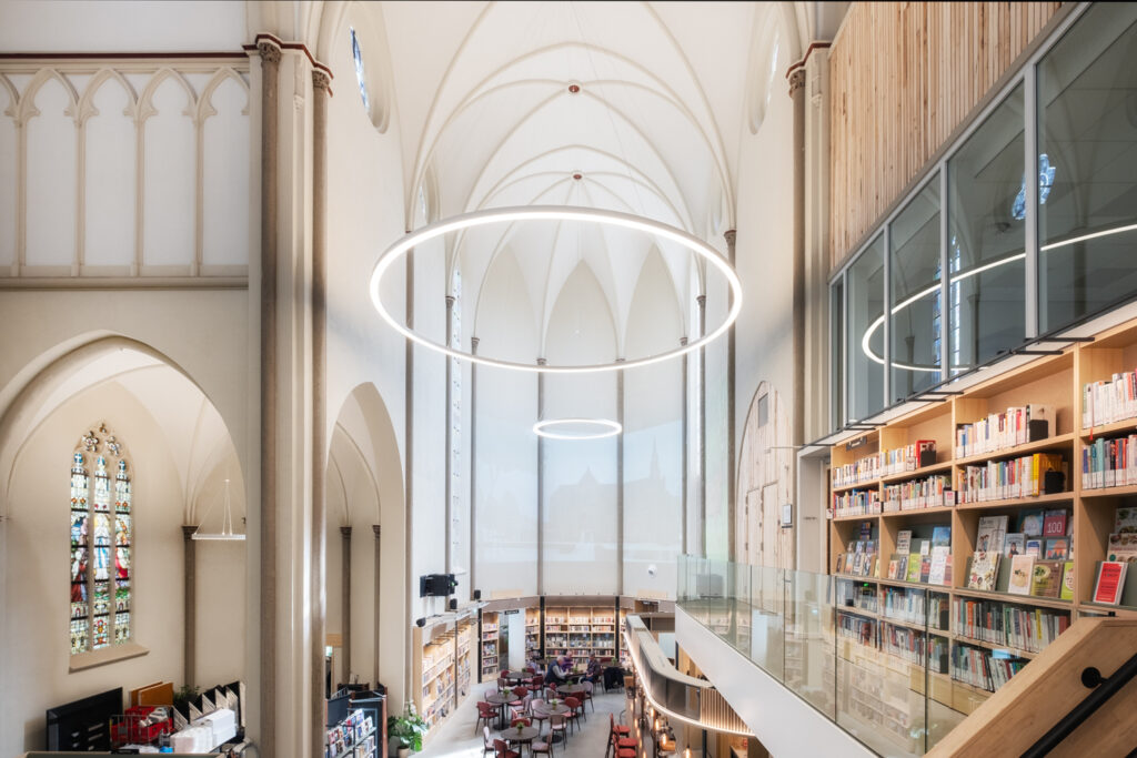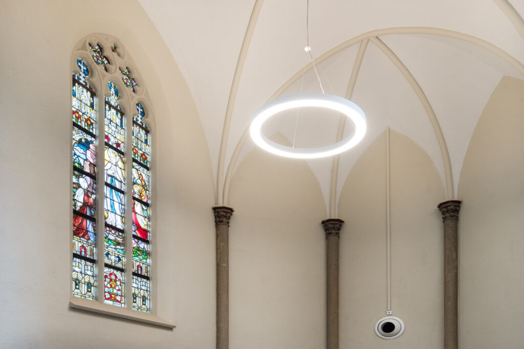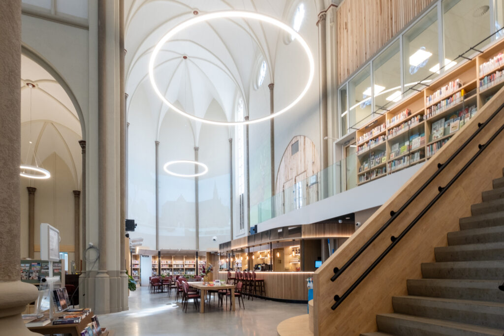 De hoge gewelven lenen zich perfect voor decoratieve ringarmaturen, die niet alleen een visuele blikvanger zijn maar ook zorgen voor een krachtige lichtopbrengst.
