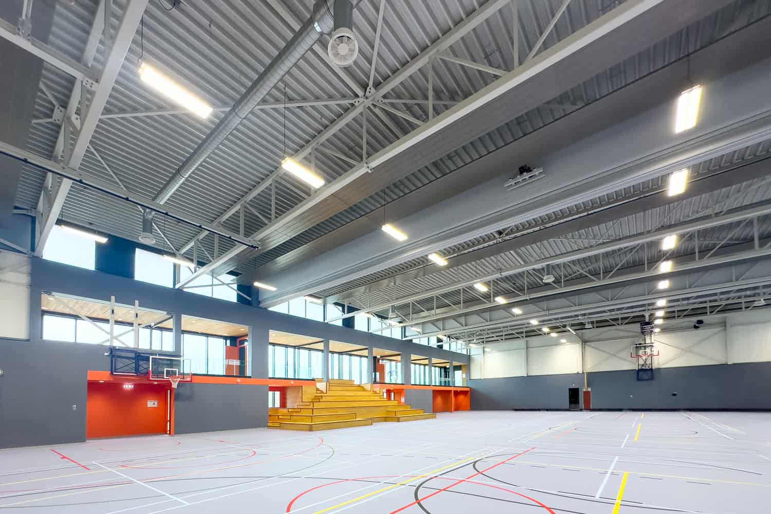 De Sportzalen zijn voorzien van LED armaturen met beschermende Ball Top Cover. In helderwit met 4.000K, DALI gestuurd met aanwezigheidssensoren voor optimale energie-efficiëntie. Ook de gangzones zijn niet vergeten: hier is gekozen voor multifunctionele LED downlighters en modulaire opbouwsystemen voor maximale flexibiliteit en uitstraling.